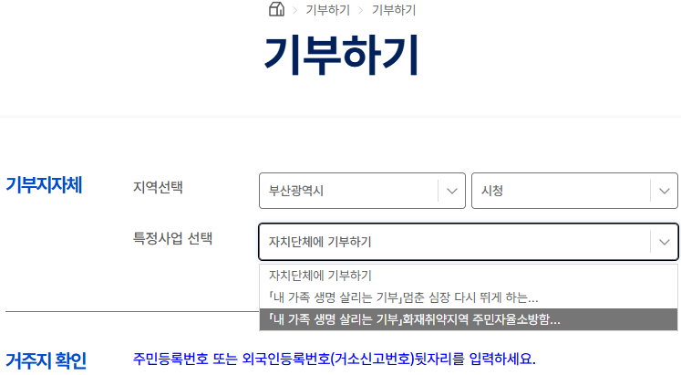 1. 기부> 자치단체에 기부하기> 기부지자체 선택 "부산광역시, 시청" > 특정사업 선택