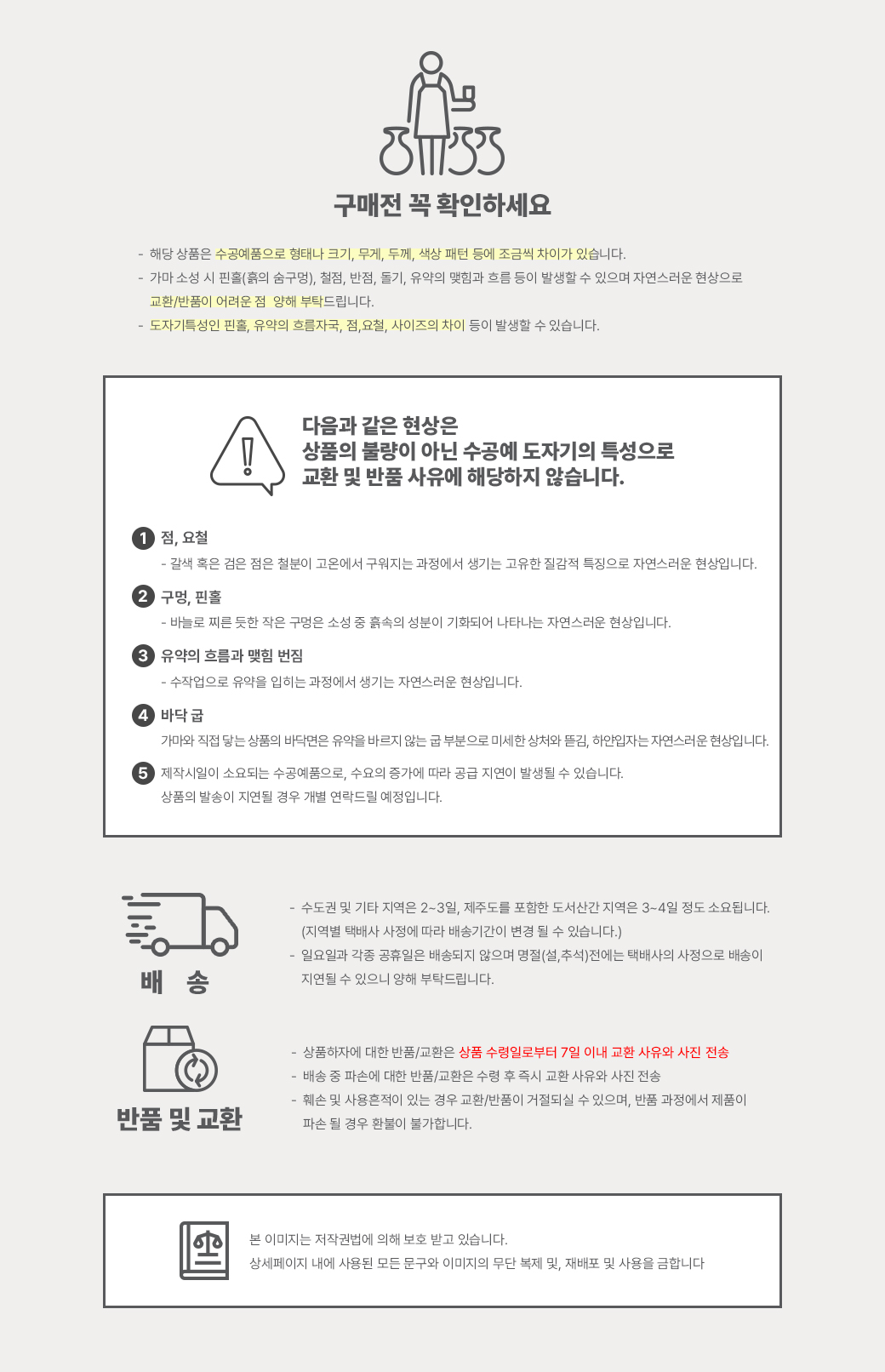 • 수령 7일 이후 전화문의 또는 사이트 신청 없이 반품한 경우 고객님께 다시 반송됨을 양해바라며, 환불/교환은 불가합니다.