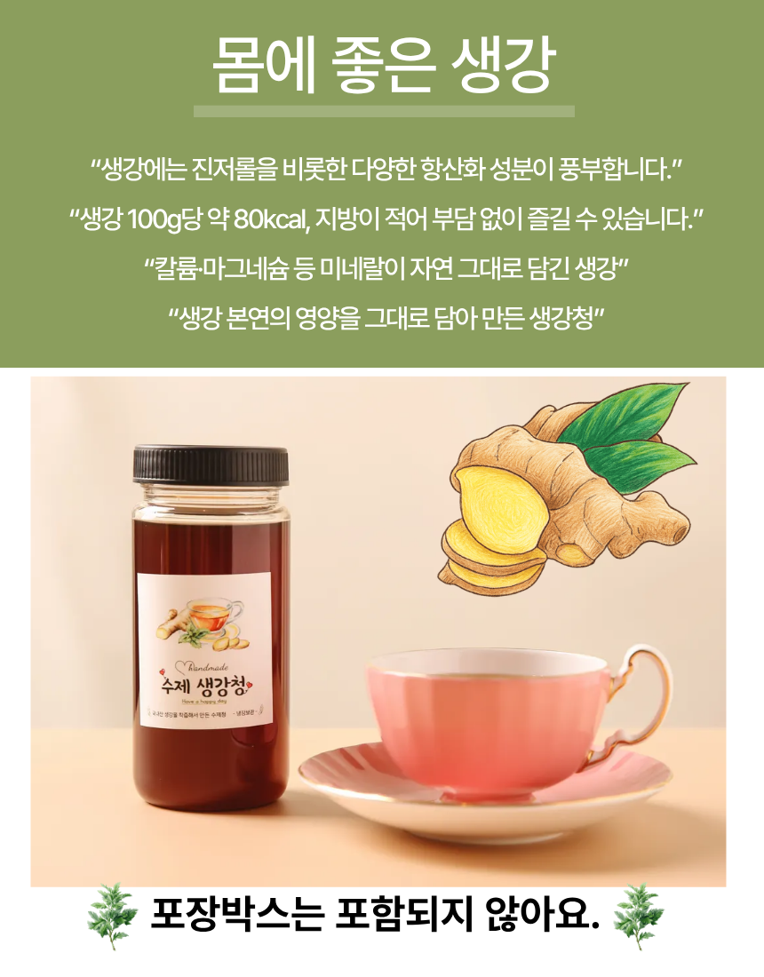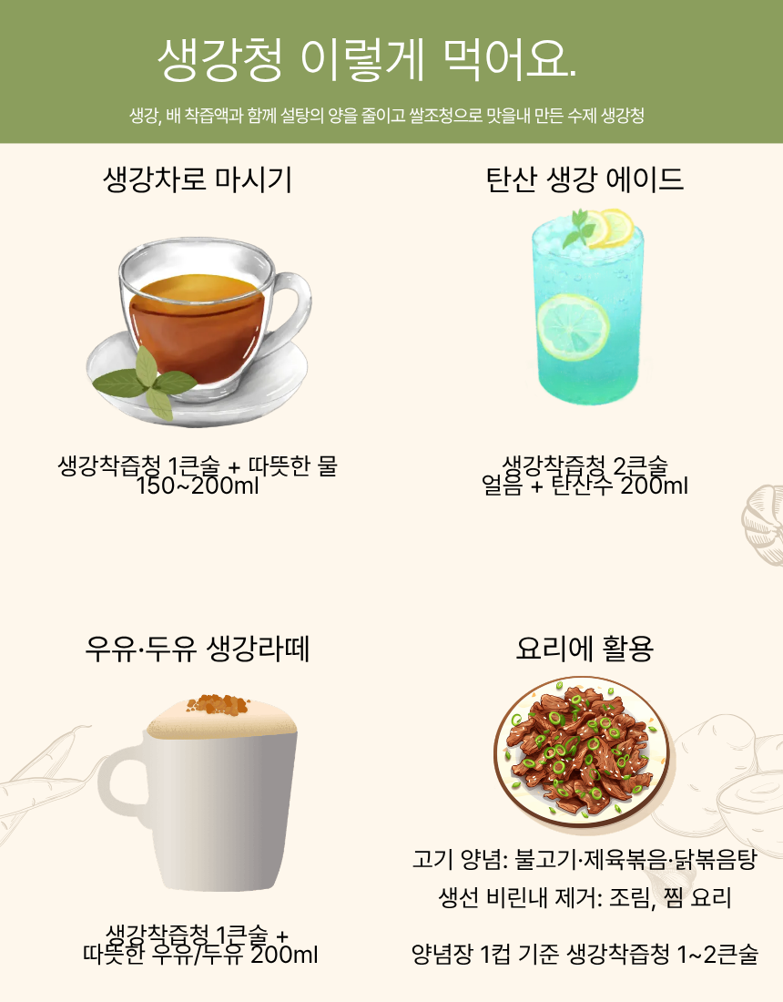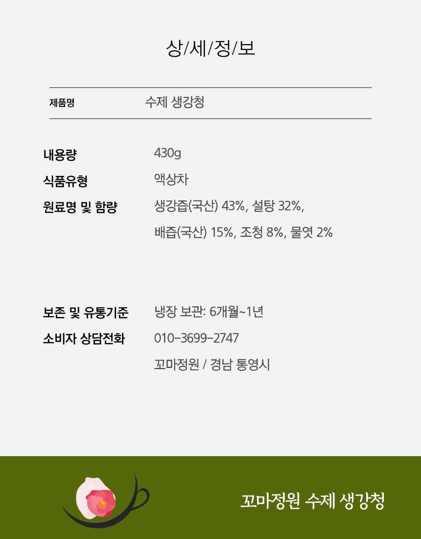 생강즙(국산) 43%, 설탕 32%, 배즙(국산) 15%, 조청 8%, 물엿 2%