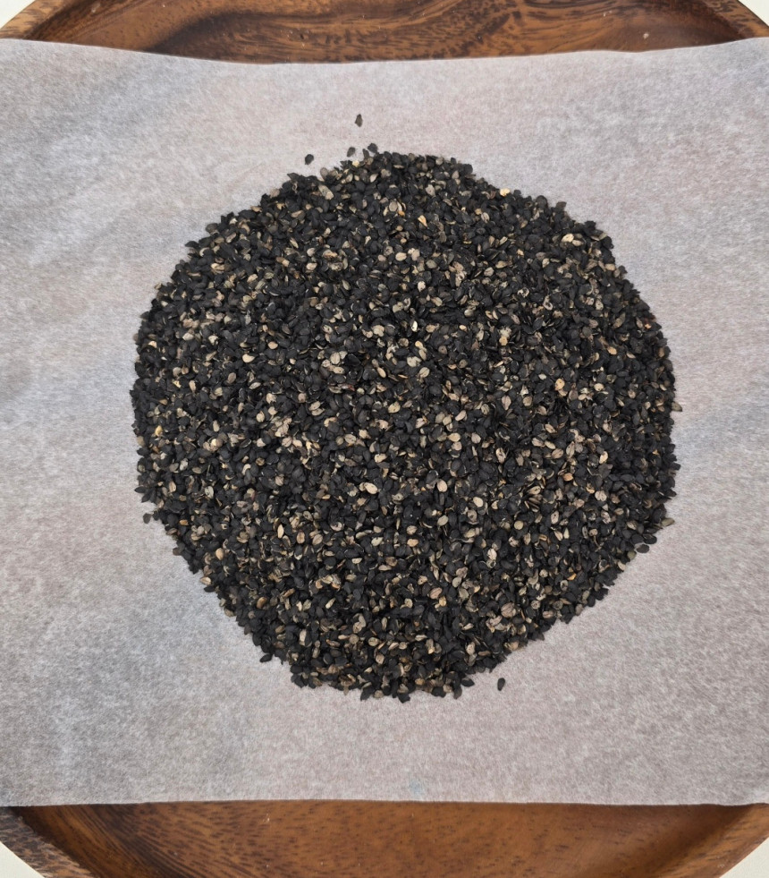 봄부터 어린 흑임자 새싹 하나 하나를 심고 여름에는 물주고 가을에는 하나씩 베고 건조시켜 마침내 흑임자 참기름으로 짰습니다