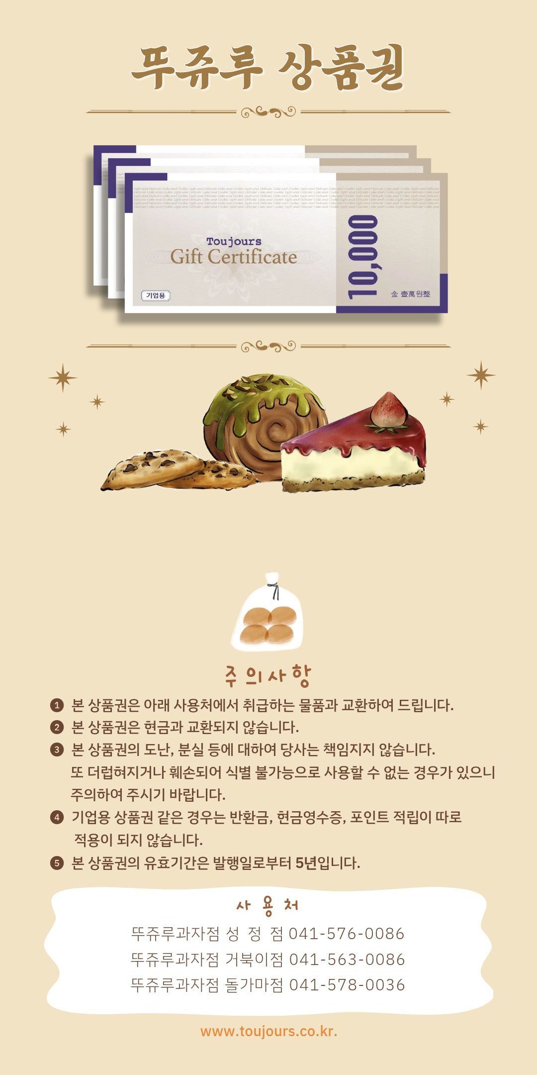 뚜쥬루 기업용 상품권은 천안에 있는 3개 지점(거북이점, 성정점, 돌가마점)에서만 사용가능하며 반환금, 현금영수증, 포인트적립은 불가합니다. 사용기간은 구매일로부터 5년이내입니다.