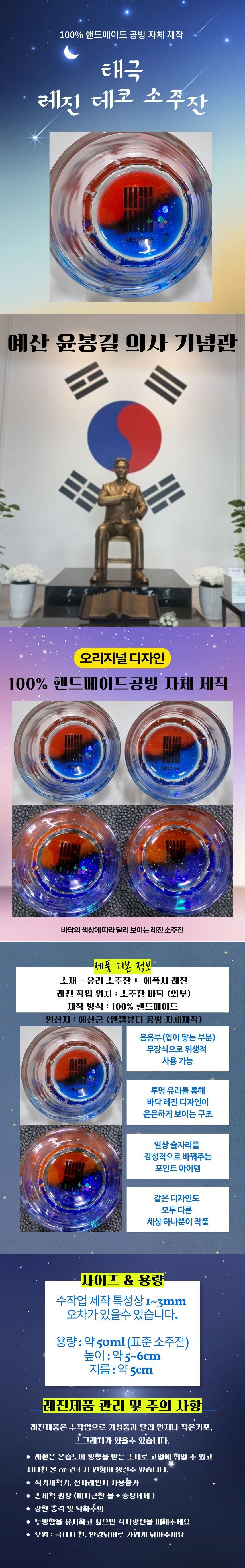 윤봉길 의사의 고향인 예산의 역사적 의미를 담아 제작한 태극 레진 데코 소주잔입니다. 2개 세트 제품 지역 공방에서 직접 제작한 100% 핸드메이드 제품입니다.