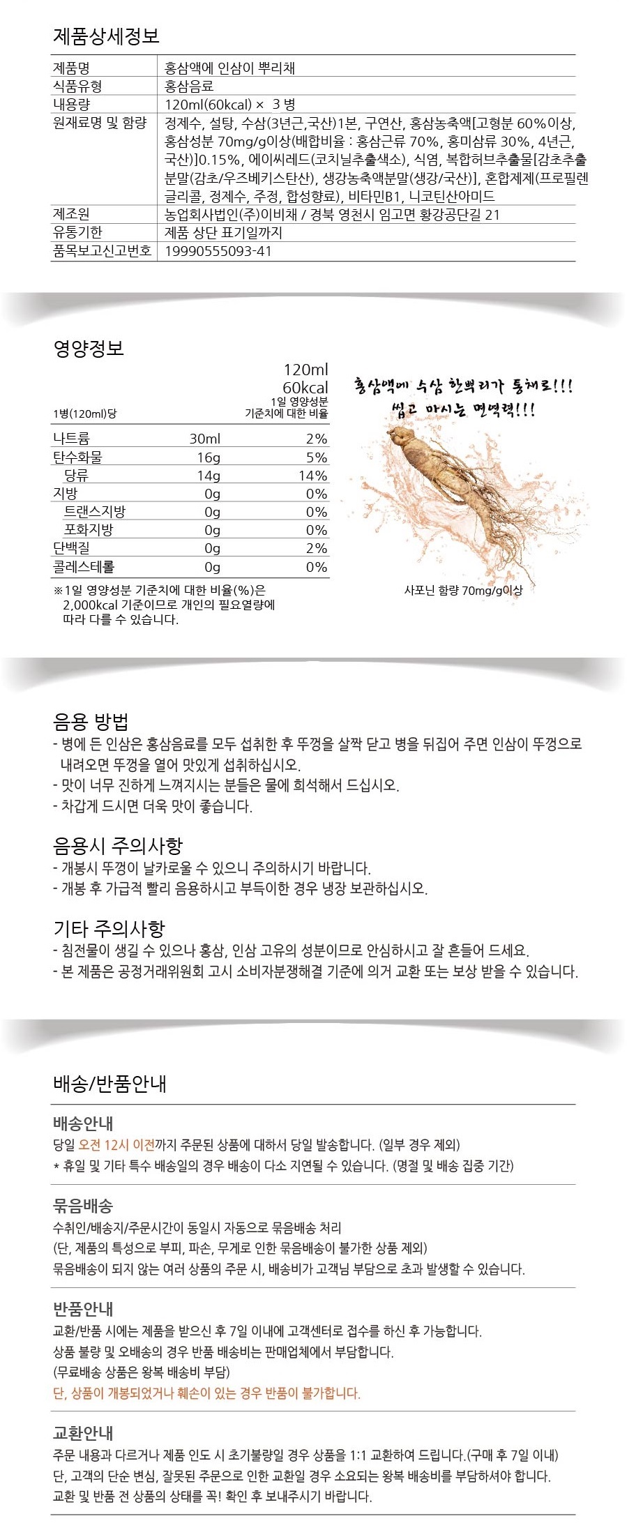100% 국내산 홍삼농축액(4년근)에 100% 국내산 수삼(3년근 이상) 1본을 통째로 담아낸 프리미엄 제품! 홍삼과 인삼을 동시에 섭취할 수 있도록 설계된 기능성 음료.