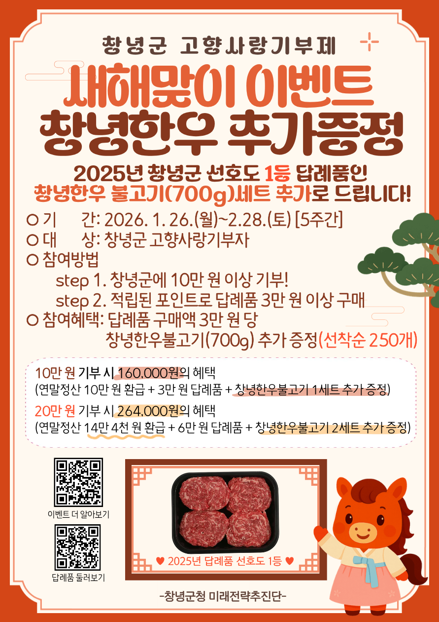 ♡ 참여혜택: 답례품 구매 금액 3만 원 당 창녕한우불고기(700g) 1세트 추가 증정