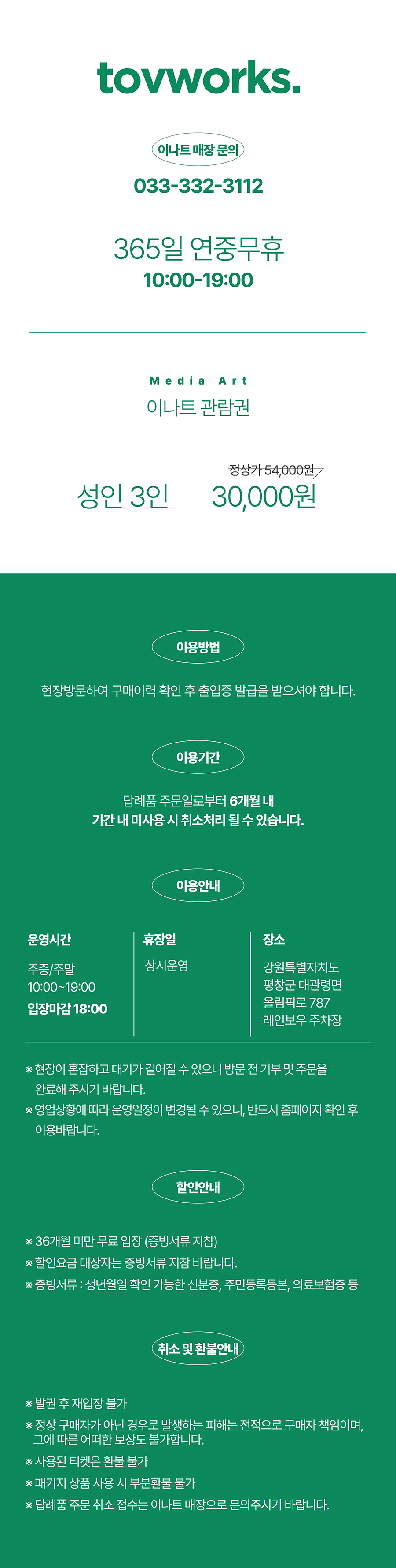 이나트관람권 성인3명 이나트 뮤지엄은 평창 여행 중 잠시 들러 쉬어가기 좋은 공간입니다. 사진으로 남길 수 있는 연인,아이 동반 가족을 위한 기억에 남는 장소입니다.
