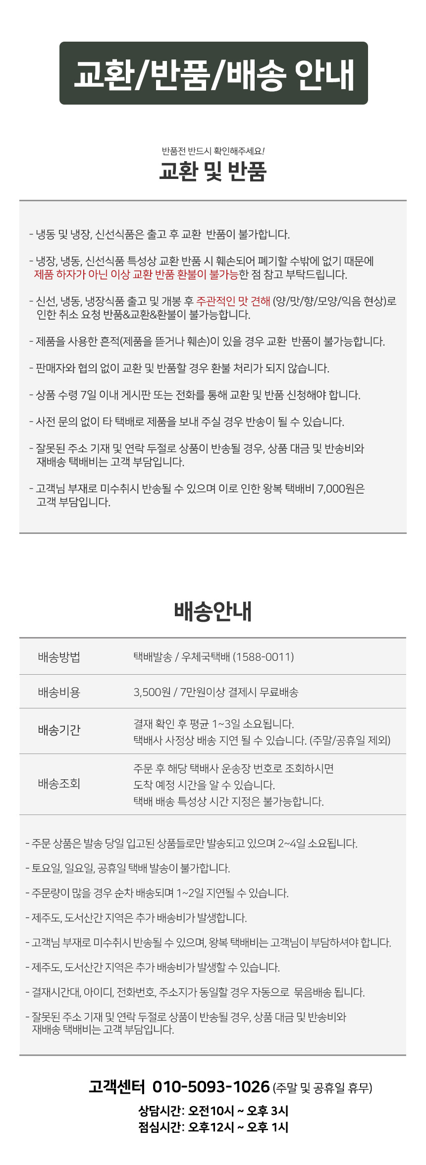 • 수령 7일 이후 전화문의 또는 사이트 신청 없이 반품한 경우 고객님께 다시 반송됨을 양해바라며, 환불/교환은 불가합니다.