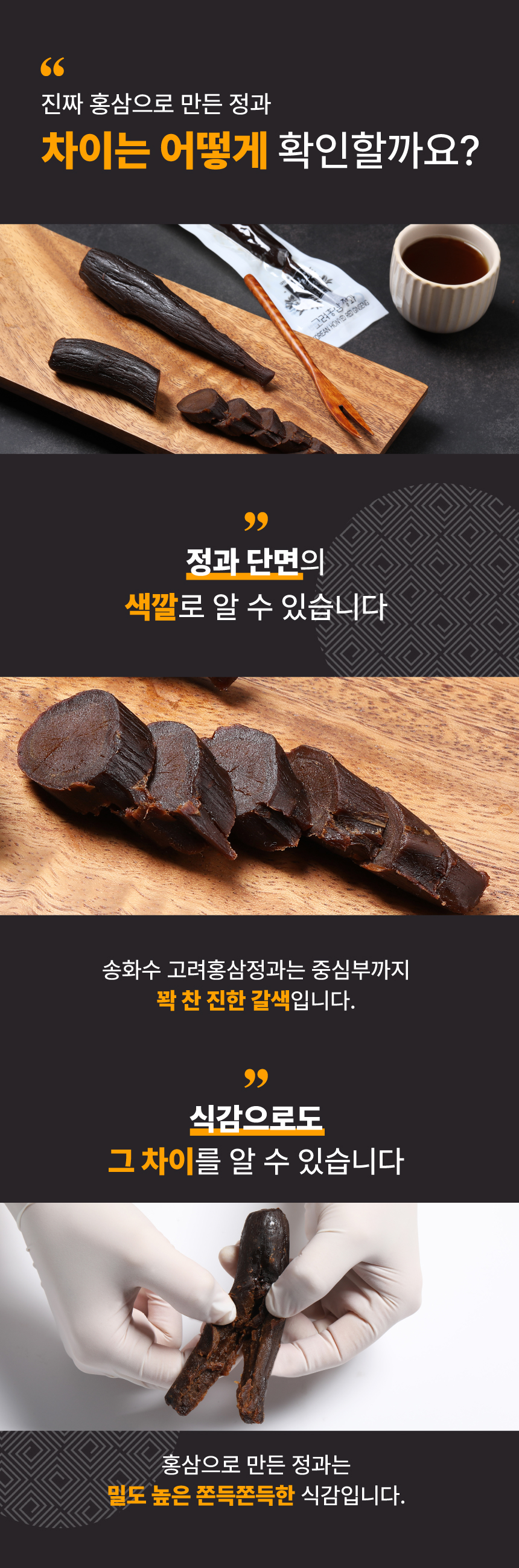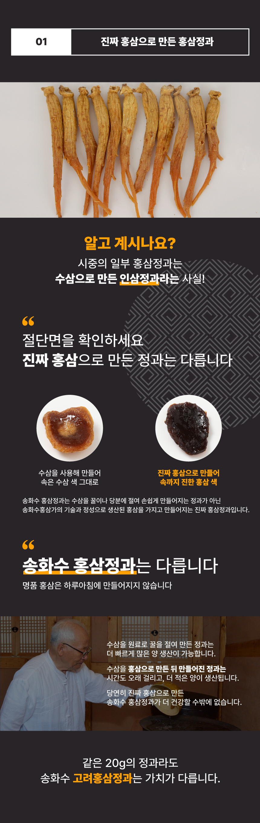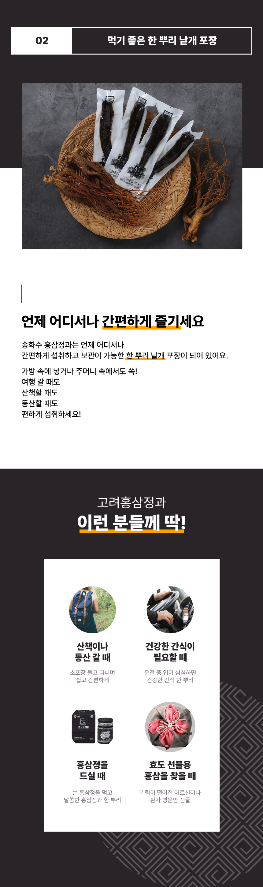 홍삼 한뿌리를 당류에 절인 우리나라 전통 건강식품. 몸에 좋으면서 칼로리가 낮은 홍삼과 열량이 높은 당류와의 합리적인 어울림.