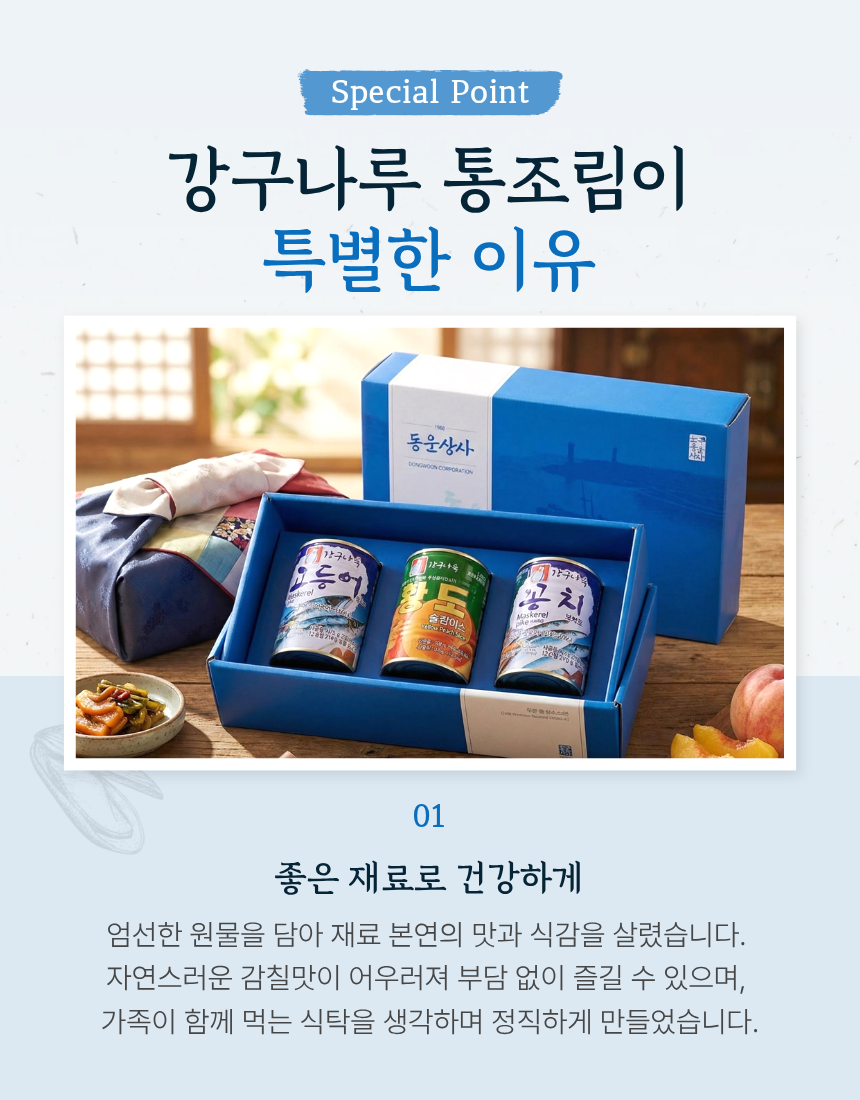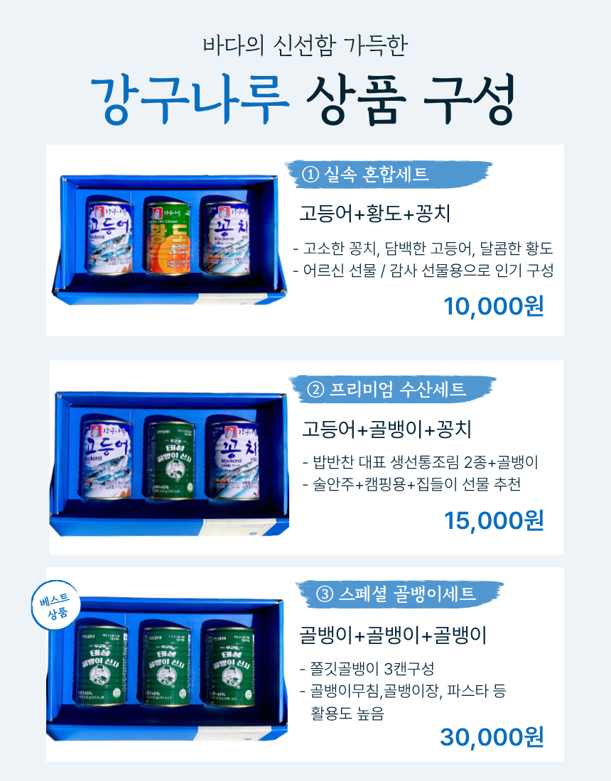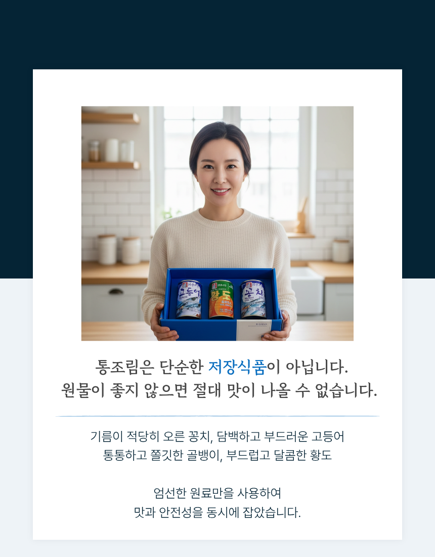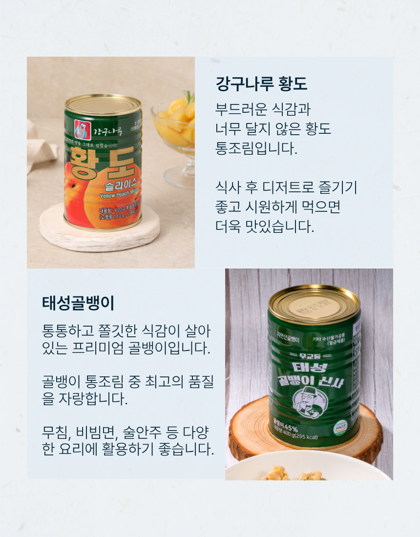 엄선한 고등어·꽁치와 달콤한 황도, 쫄깃한 골뱅이를 담은 실속 통조림 세트로, 선물과 가정용 모두 만족스러운 선택입니다.