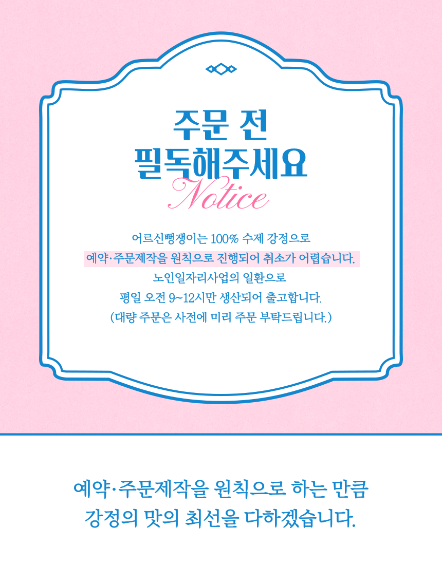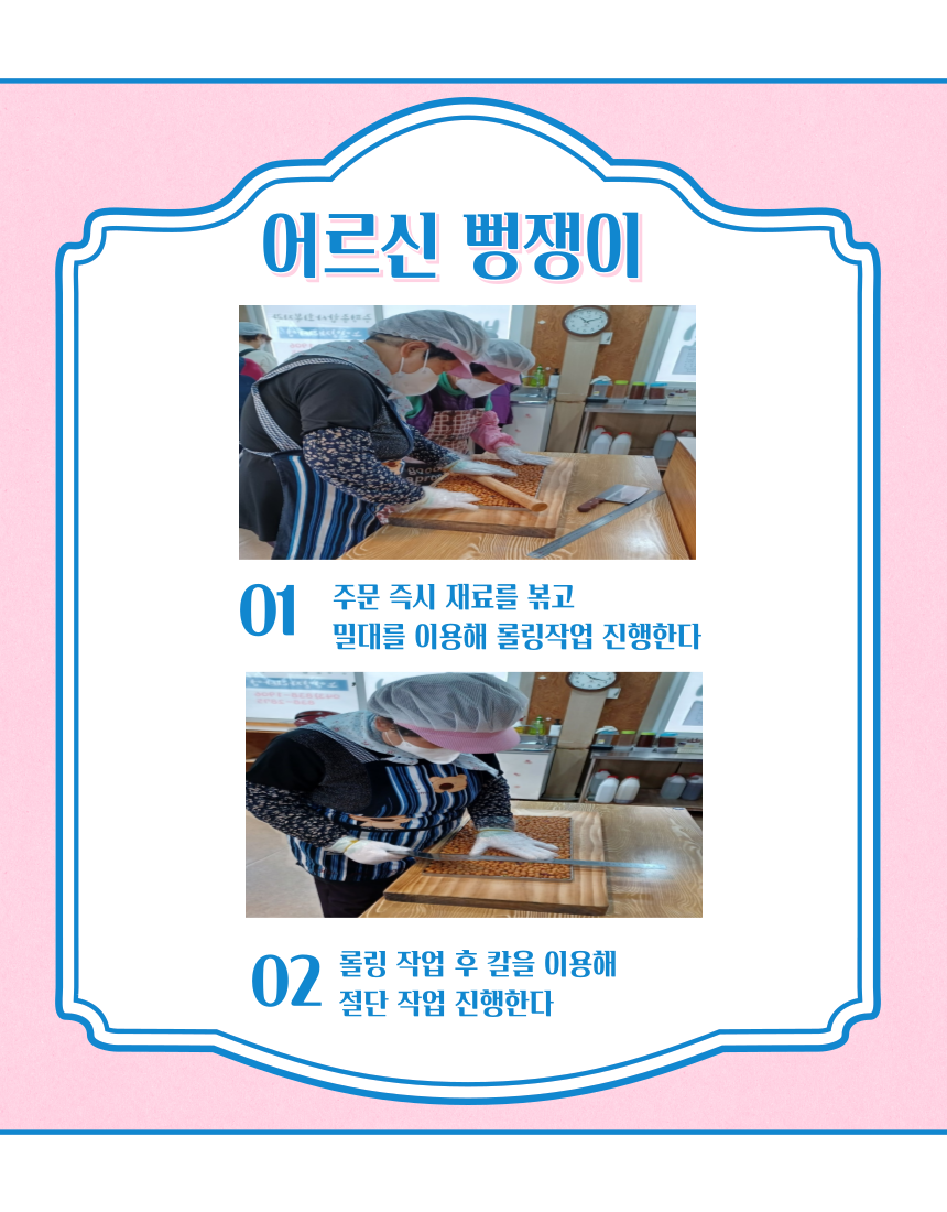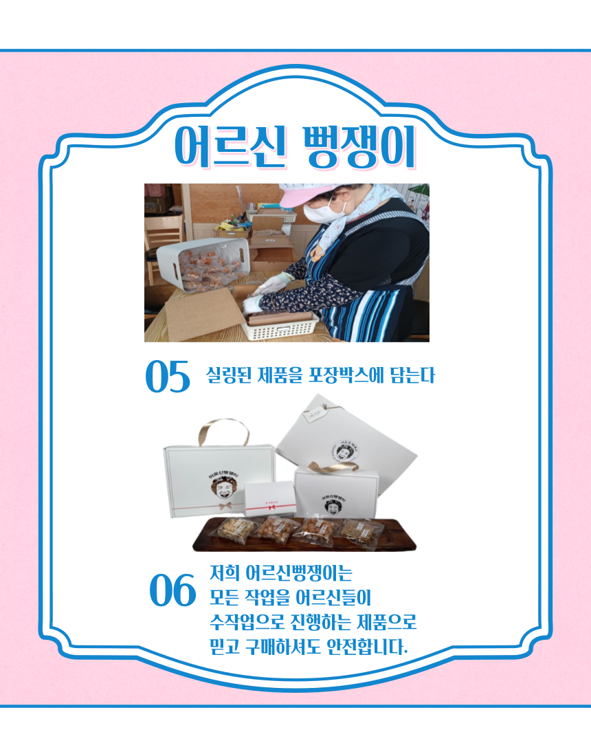 어르신뻥쟁이는 100% 수제 강정으로 노인일자리 어르신들이, 주문 즉시 생산하여 출고합니다.