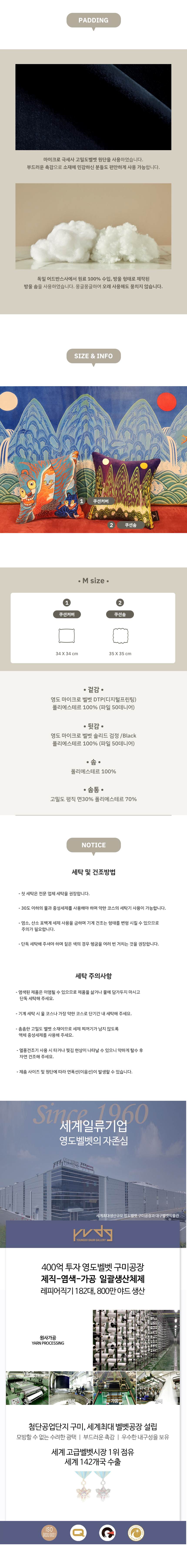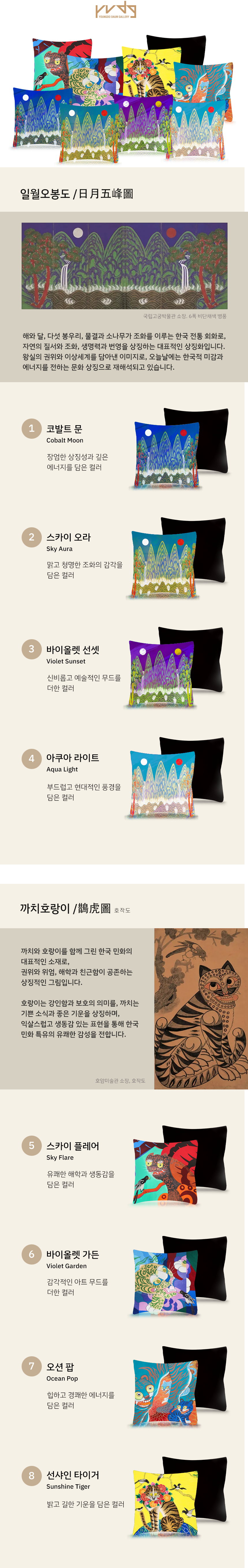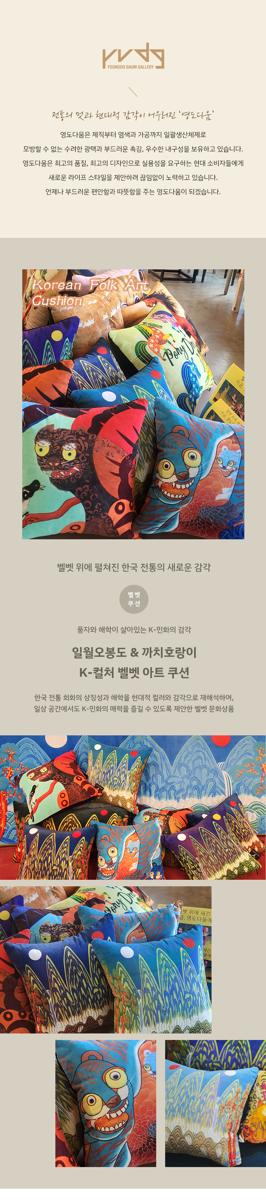 한국 전통 민화인 일월오봉도와 까치호랑이를 현대 감각으로 풀어낸 벨벳 아트 쿠션 / 60년 영도벨벳의 기술로 제작