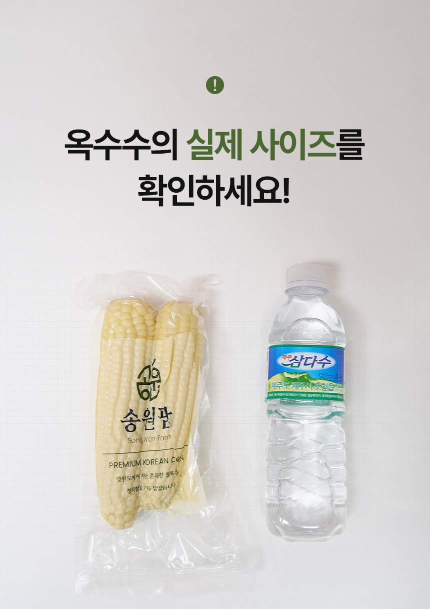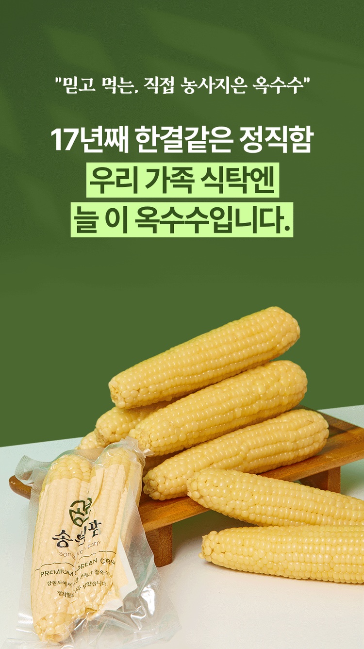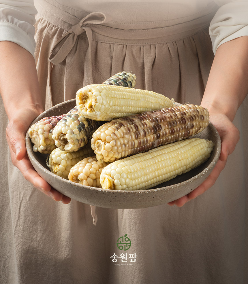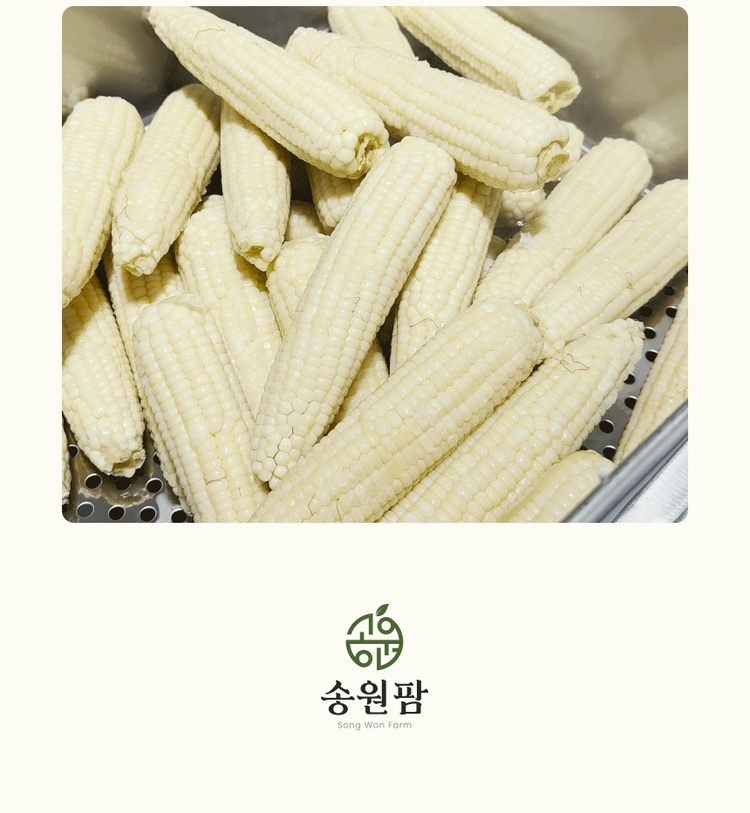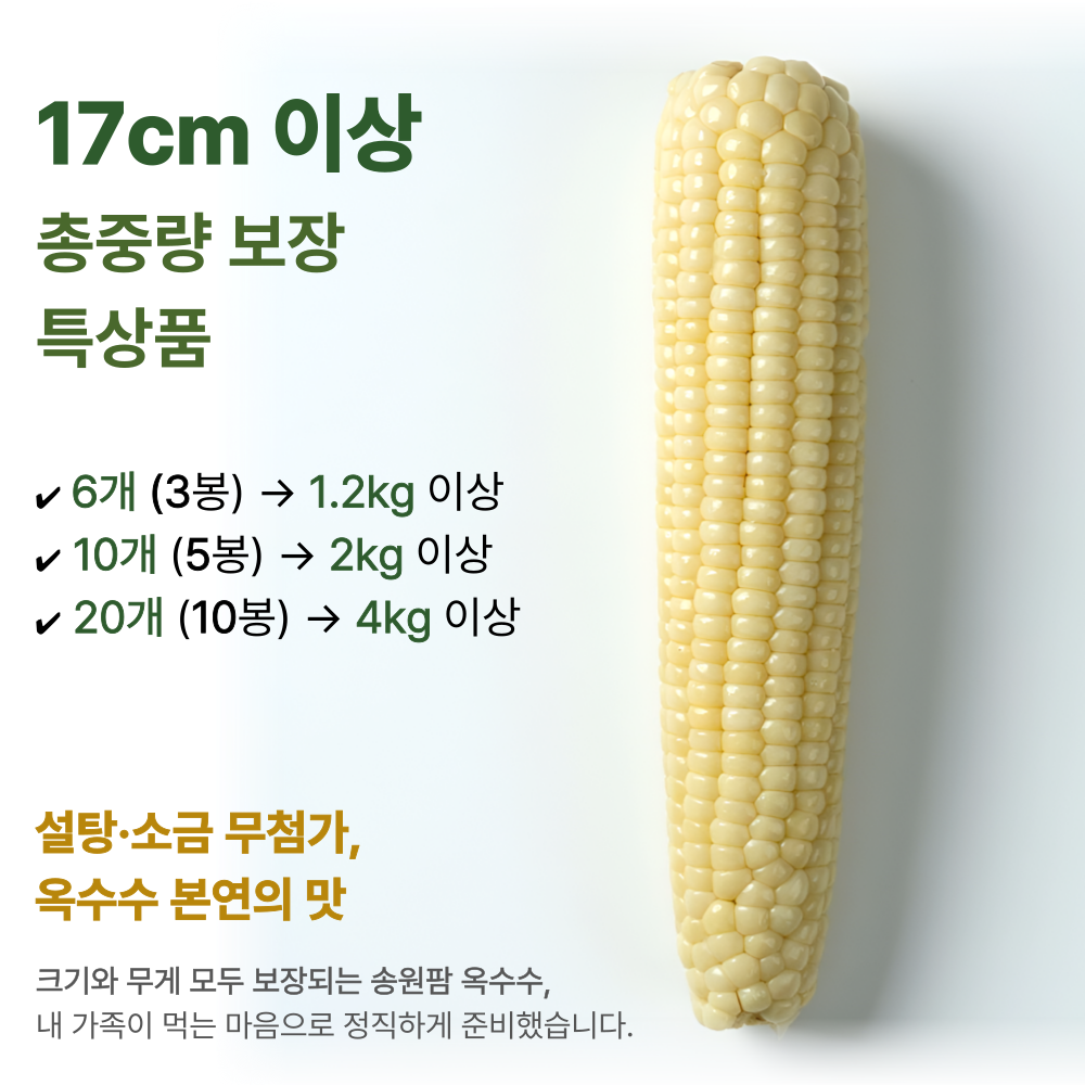 설탕, 소금을 무첨가한 강원도 영월 미백찰옥수수 수확직후 스팀, 진공, 급냉으로 본연의 맛을 유지 10개입 총 2kg이상 중량, 잔류농약 463종 항목 불검출 시험성적서 보유
