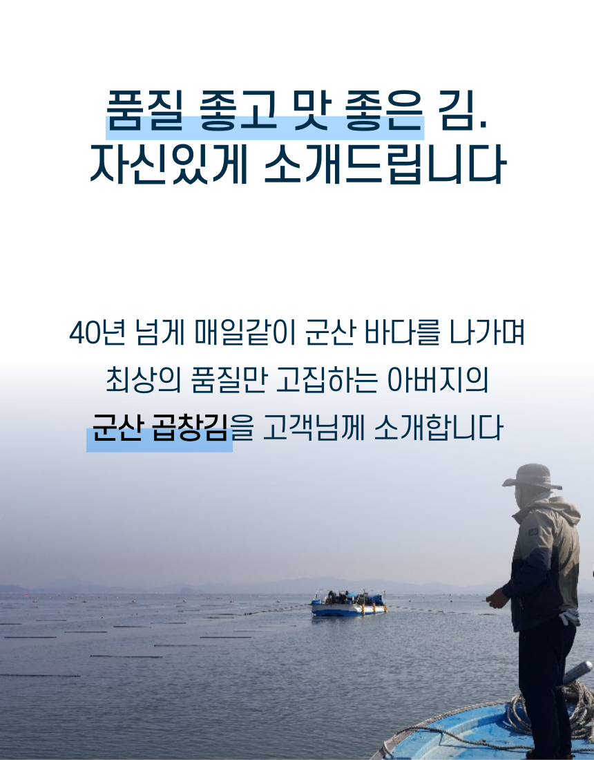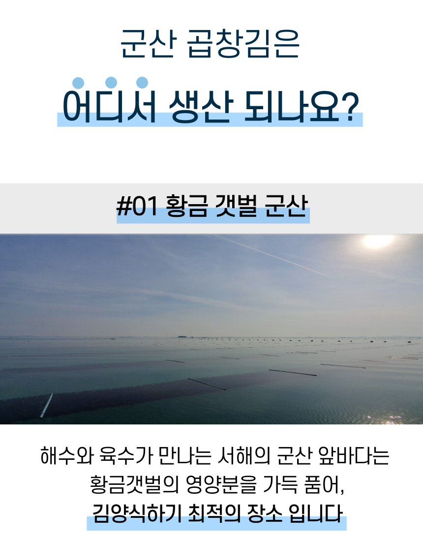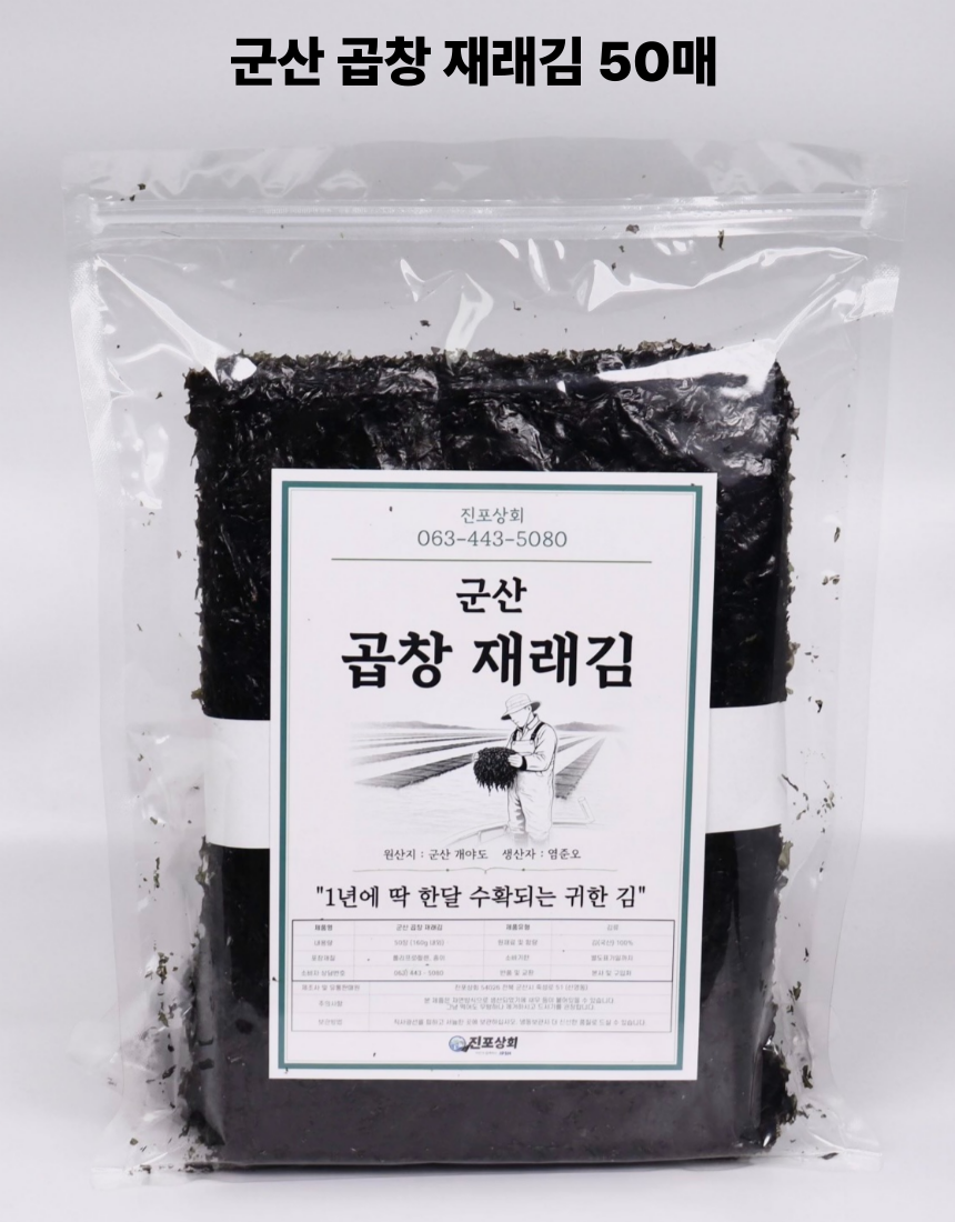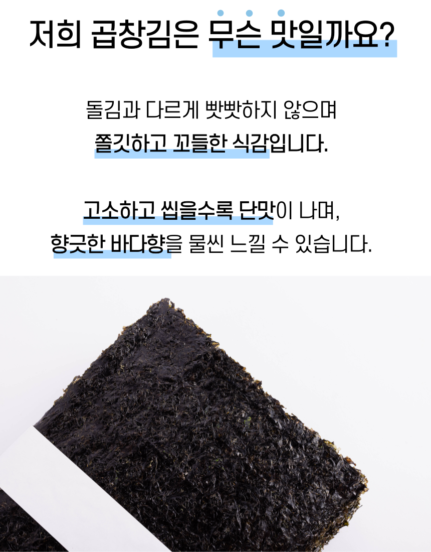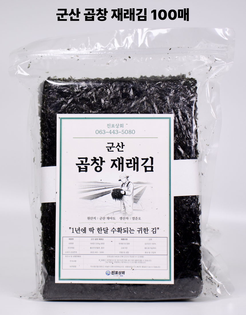 군산 앞바다에서 직접 농사지은 곱창김. 1년에 단 한달 정도만 생산되며 꼬들 쫄깃한 식감과 바다의 깊은 풍미가 진하게 느껴집니다. 마른김으로써 다양한 요리에 활용하기 좋습니다.