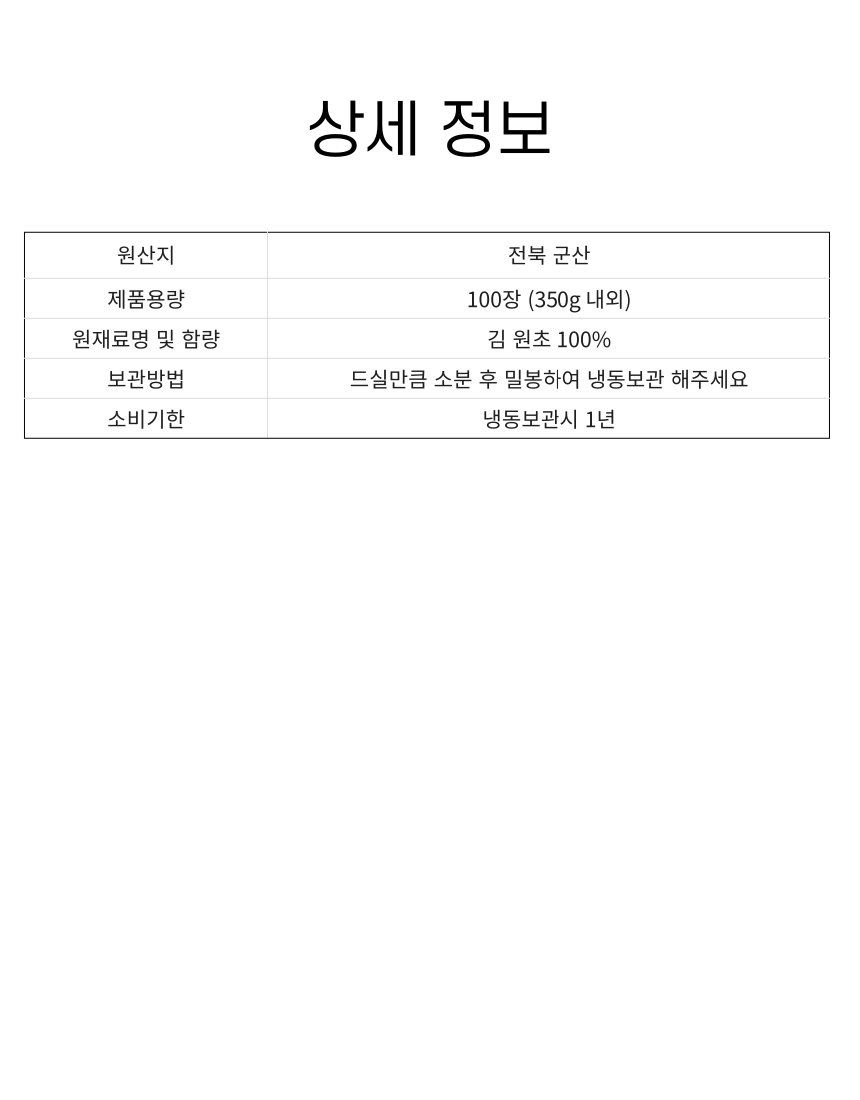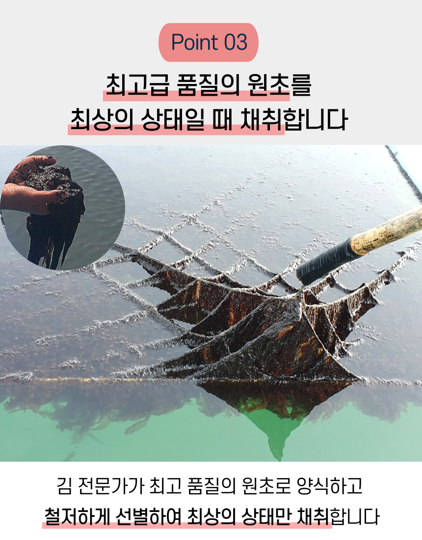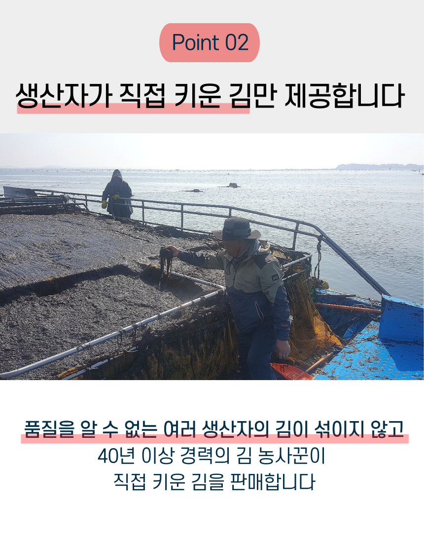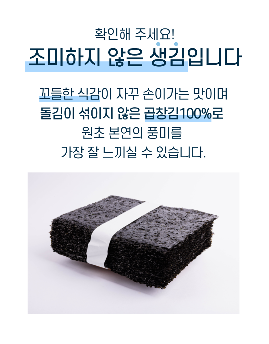 군산 앞바다에서 직접 농사지은 곱창김. 1년에 단 한달 정도만 생산되며 꼬들 쫄깃한 식감과 바다의 깊은 풍미가 진하게 느껴집니다. 마른김으로써 다양한 요리에 활용하기 좋습니다.