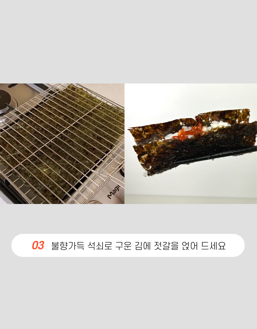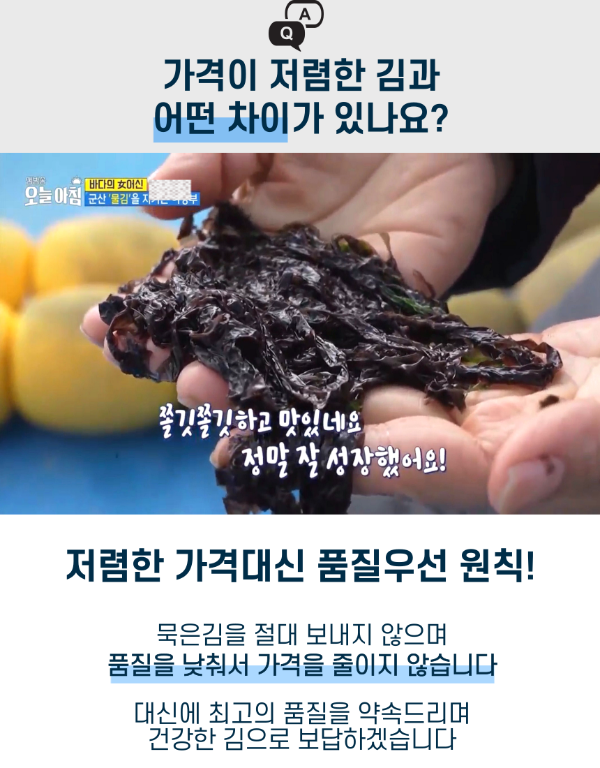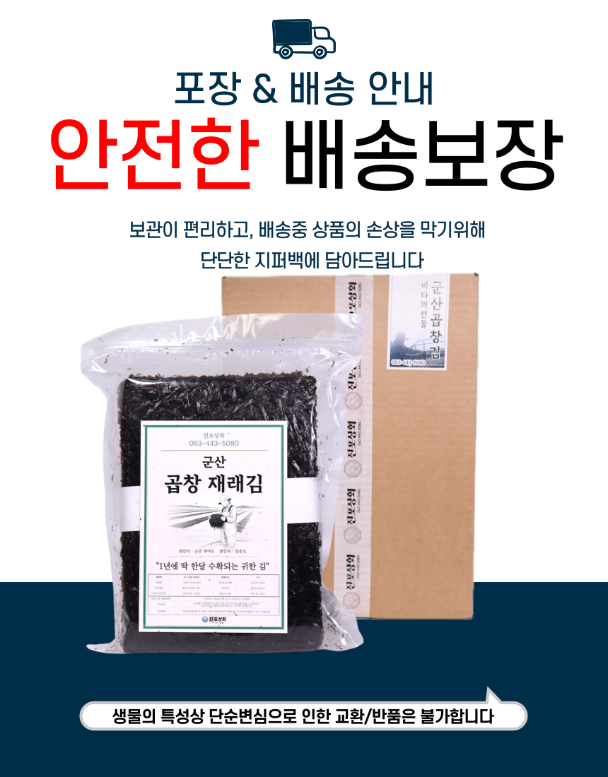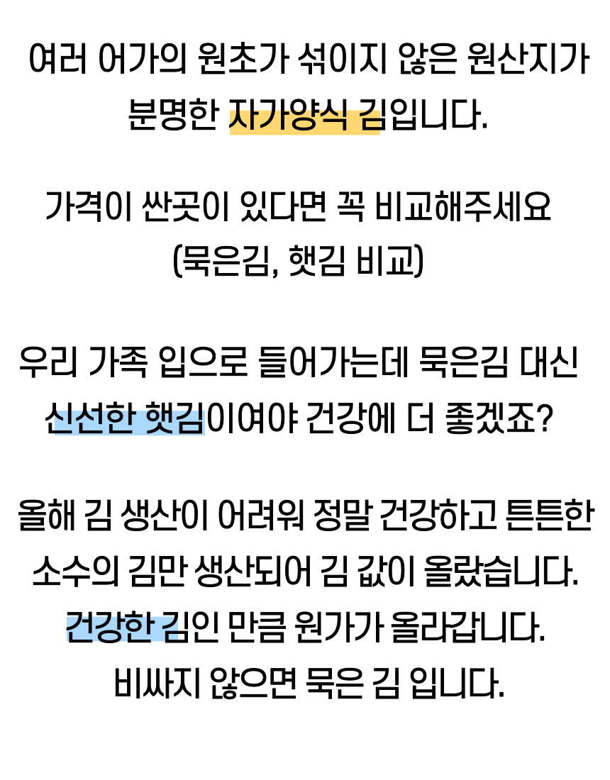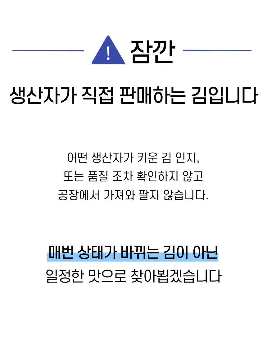 군산 앞바다에서 직접 농사지은 곱창김. 1년에 단 한달 정도만 생산되며 꼬들 쫄깃한 식감과 바다의 깊은 풍미가 진하게 느껴집니다. 마른김으로써 다양한 요리에 활용하기 좋습니다.