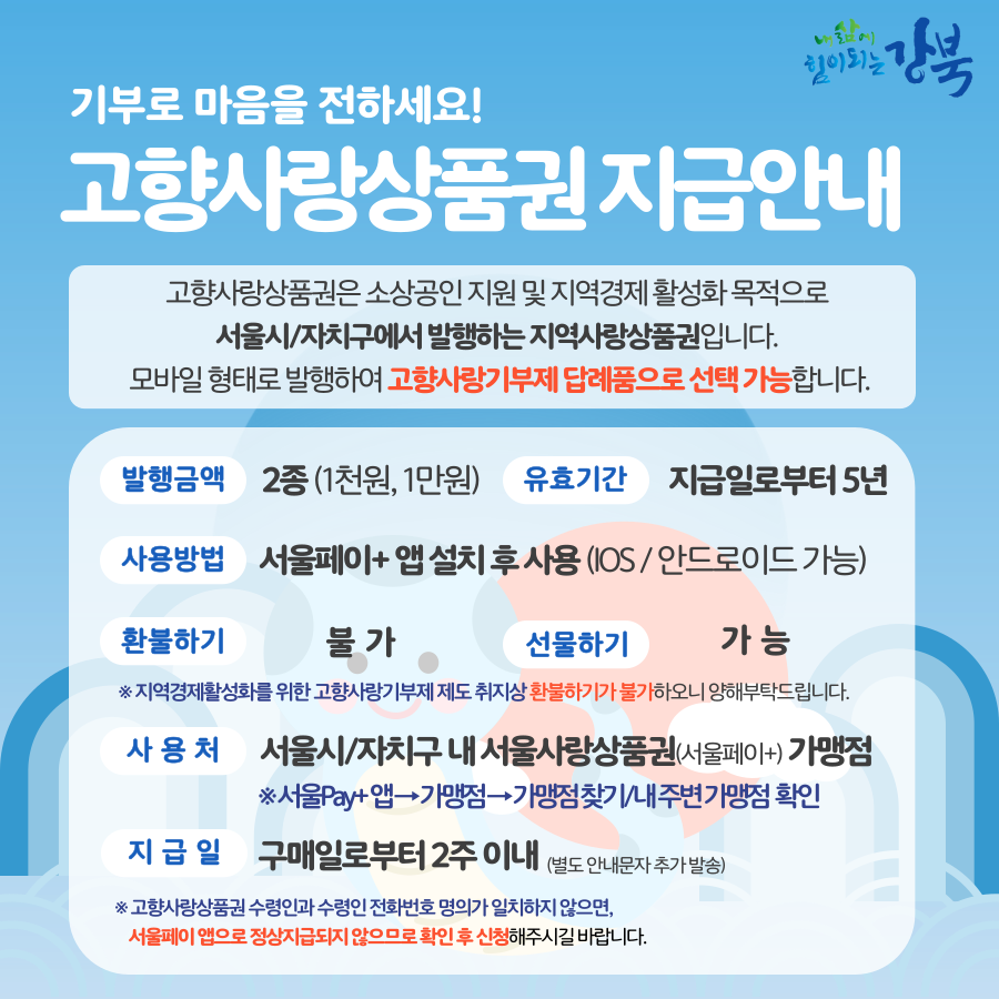 기부하신 소중한 기부금은 내 삶에 힘이 되는 강북구를 만들기 위한 주민 복리 증진 사업에 사용하겠습니다.