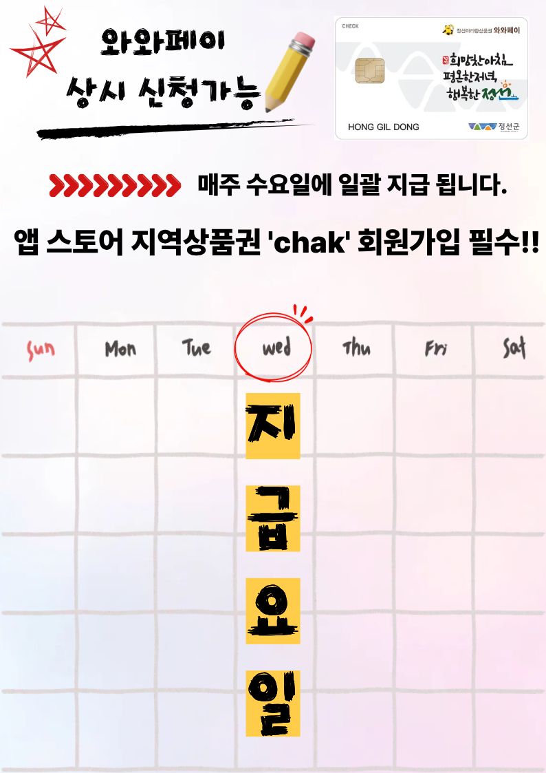 카드형 정선아리랑상품권 '와와페이' 입니다. 스마트폰 앱 '지역상품권 chak' 설치 후 회원가입, 체크카드발급 하시면 답례상품권을 충전해 드립니다.