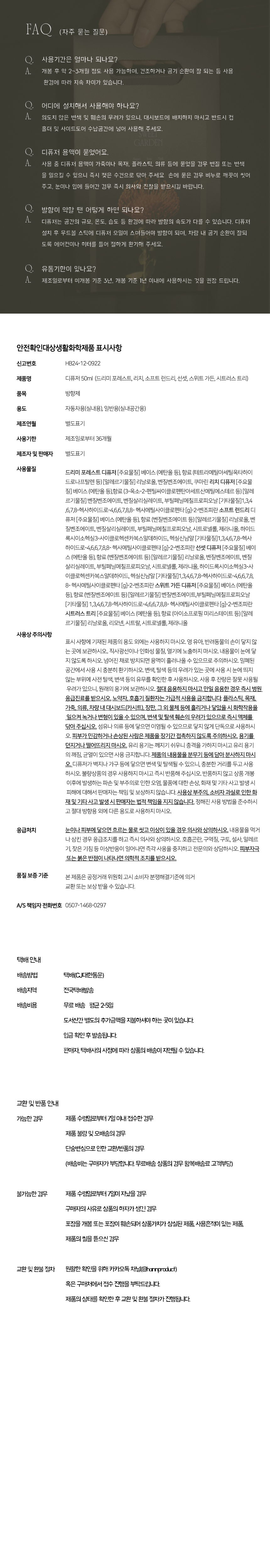 수령 7일 이후 전화문의 또는 사이트 신청 없이 반품한 경우 고객님께 다시 반송됨을 양해바라며, 환불/교환은 불가합니다. 사용중 발생한 하자의 교환/환불/수리 등은 ‘공정거래위원회 소비자분쟁해결기준’에 준하여 처리됩니다.