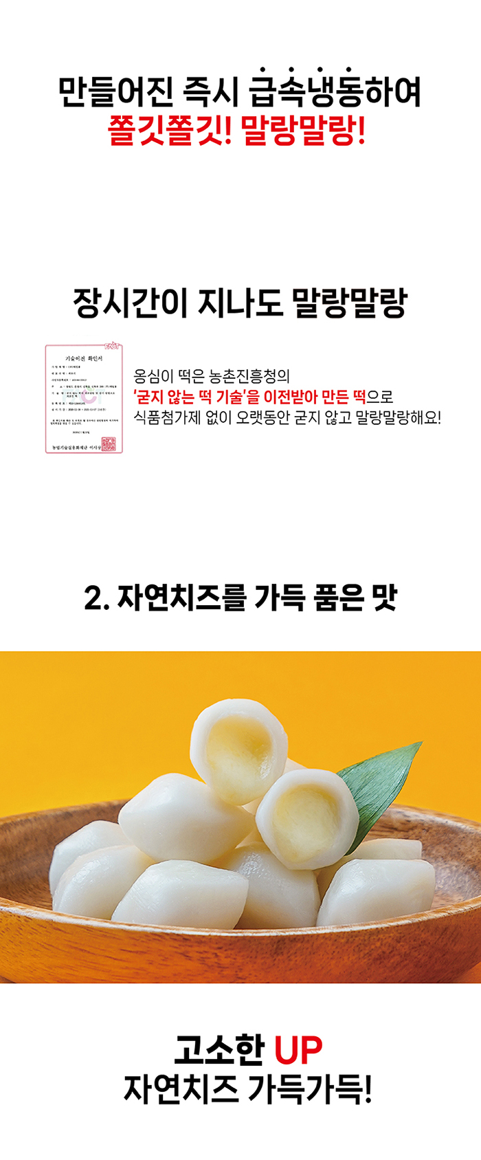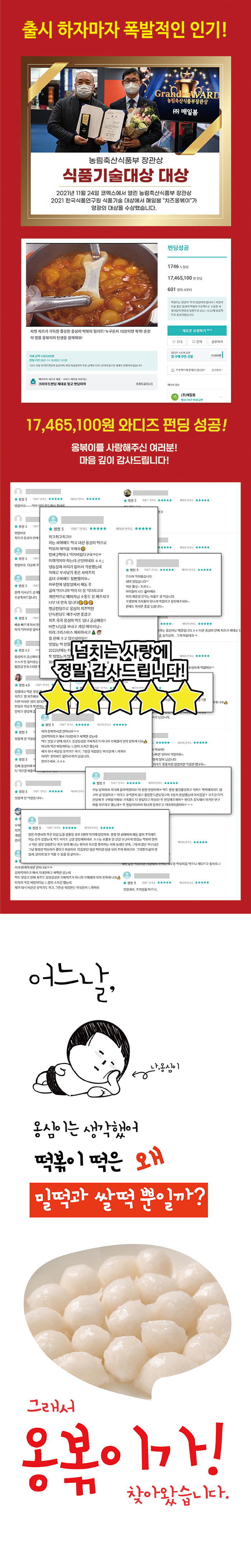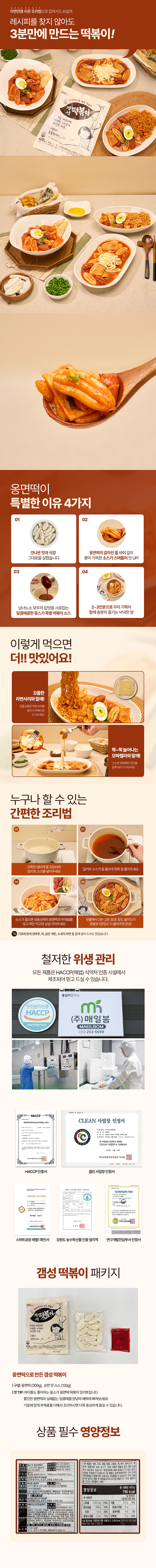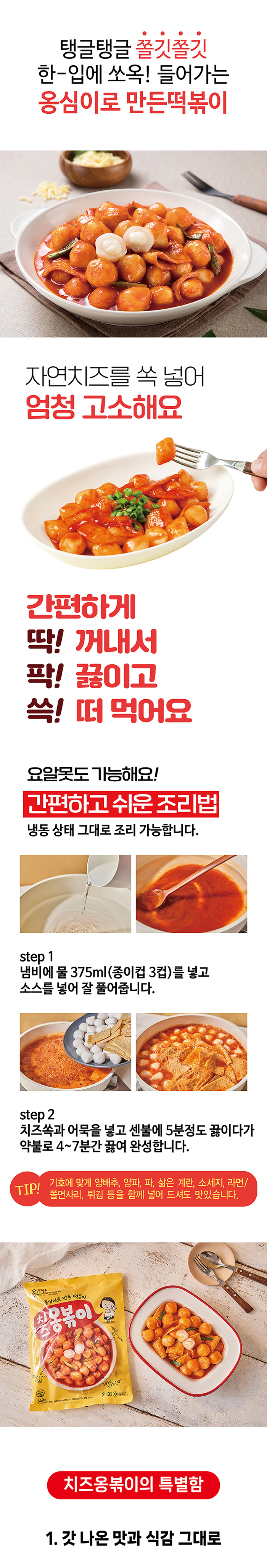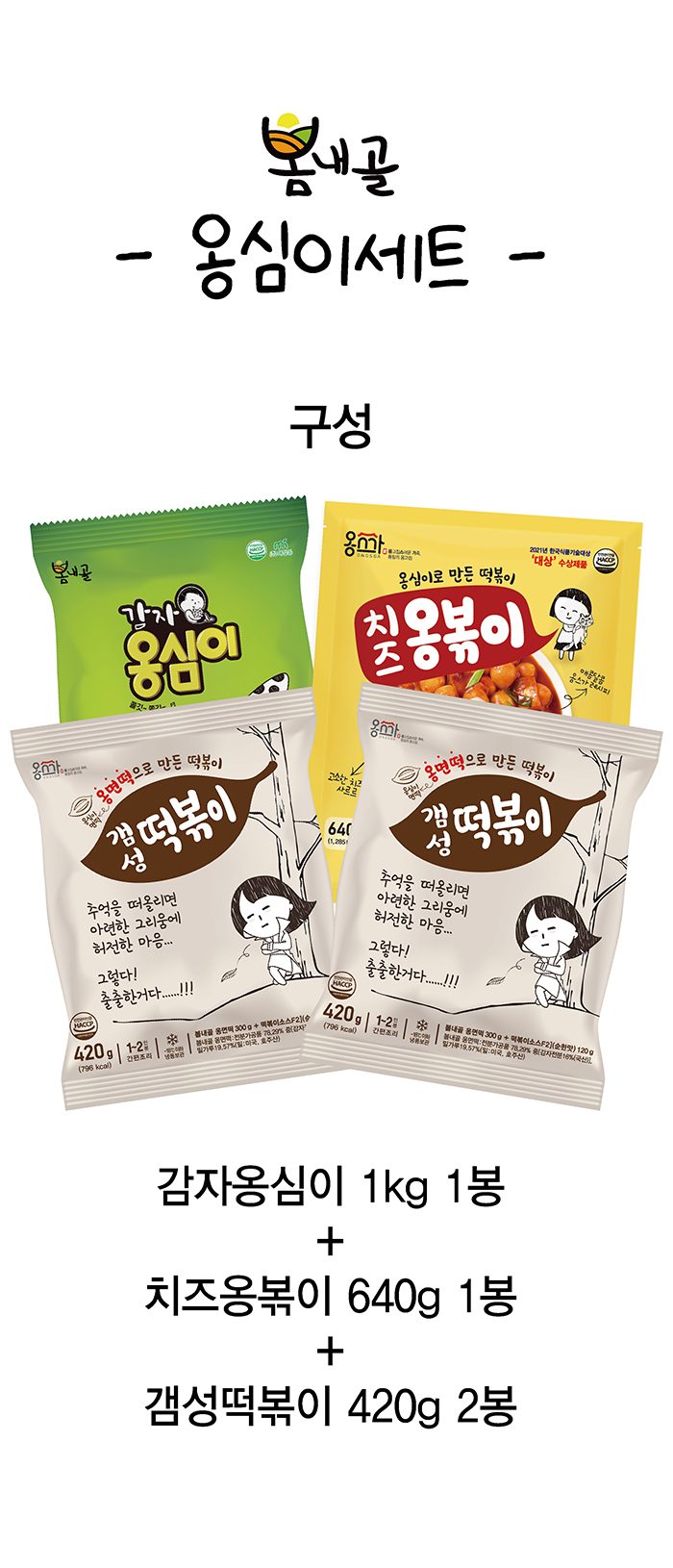 ○가성비와 가심비를 모두 만족시키는 세트 - 감자옹심이와 떡볶이 밀키트 제품들로 구성됨 - 구성 : 감자옹심이 1kg 1봉 + 치즈옹볶이 640g 1봉 + 갬성떡볶이 420g 2봉