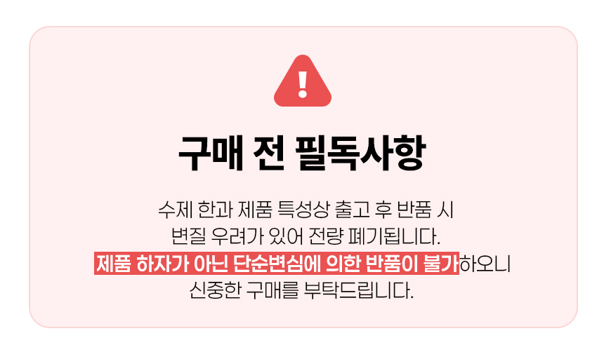 • 수령 7일 이후 전화문의 또는 사이트 신청 없이 반품한 경우 고객님께 다시 반송됨을 양해바라며, 환불/교환은 불가합니다.